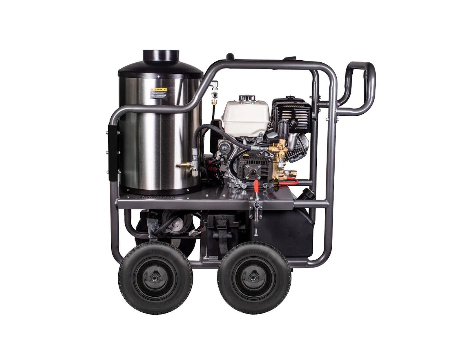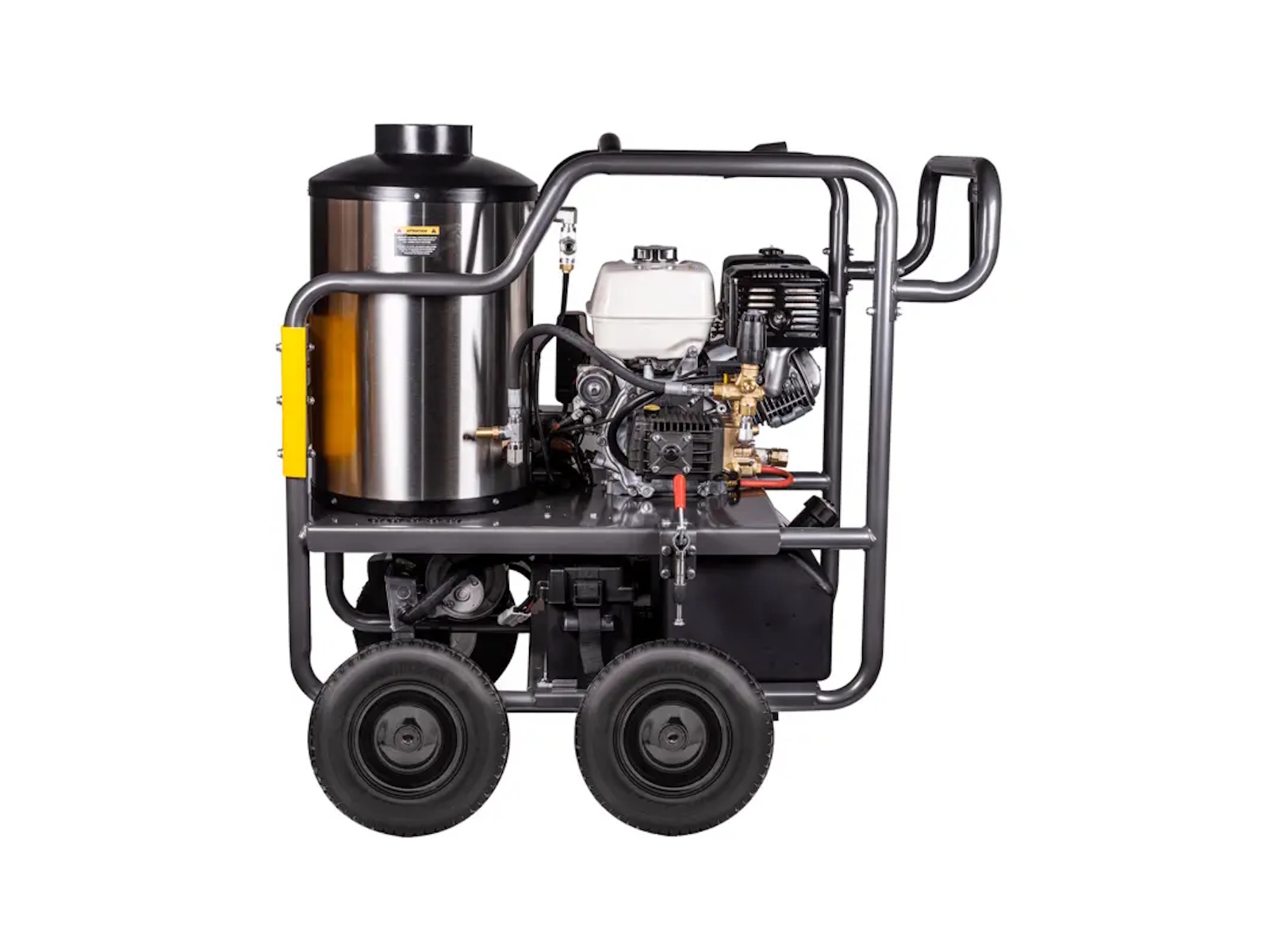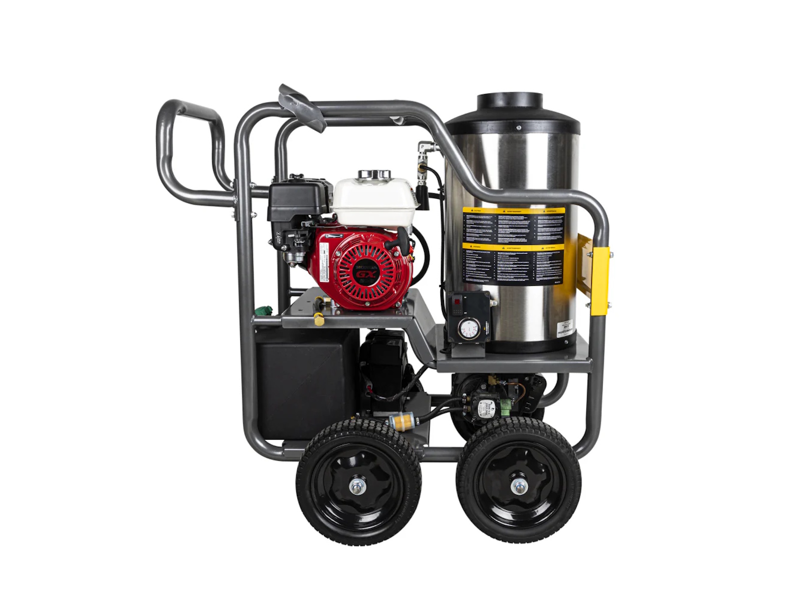 The HW4013HG is framed by a powder-coated steel chassis, designed to handle rough terrain, long workdays, and harsh conditions. A roll cage design protects the core components—engine, pump, and burner—while offering easy access for service, fueling, or maintenance.