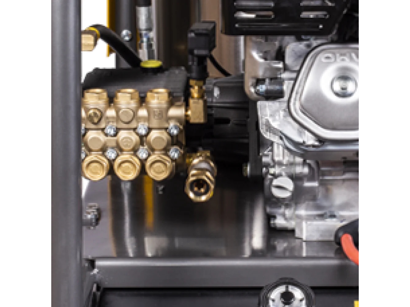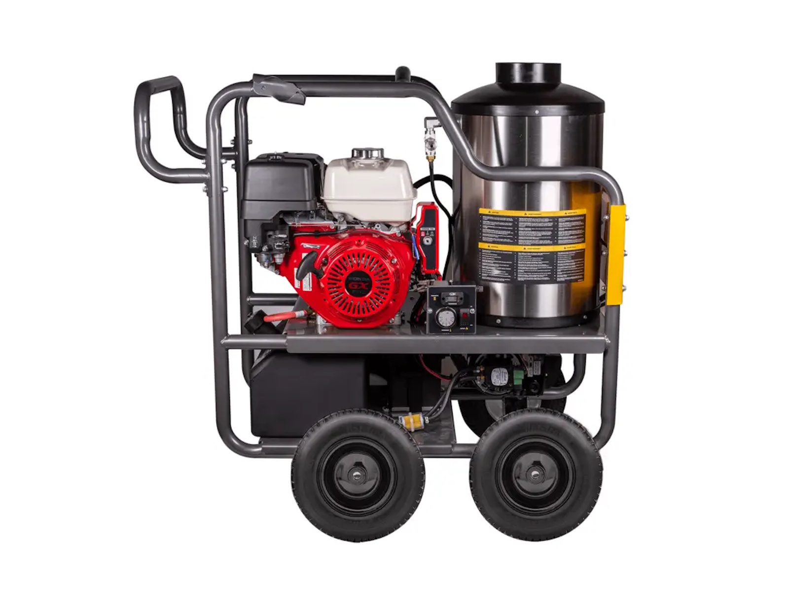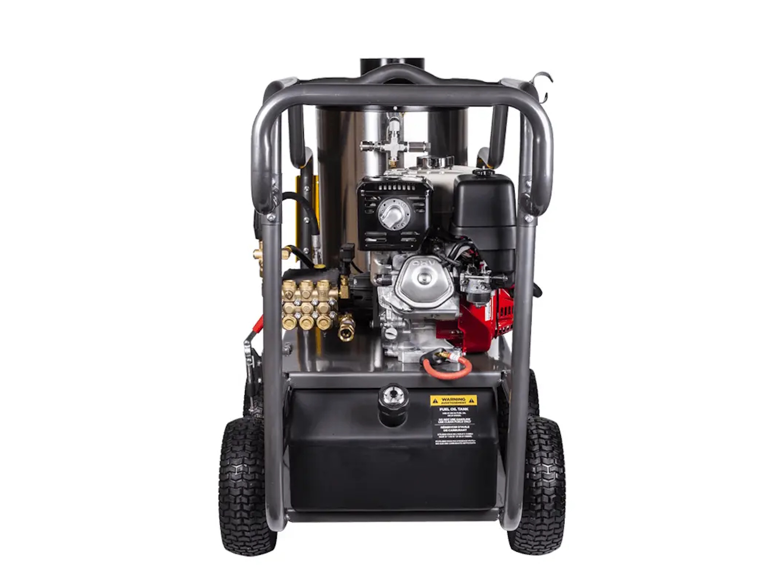 At the heart of this hot water pressure washer is the Honda GX390 389cc engine, a cornerstone of commercial power equipment. Designed for reliability and longevity, it features OHV technology, a cast iron cylinder sleeve, low oil shutdown, and a quiet-yet-powerful operation.