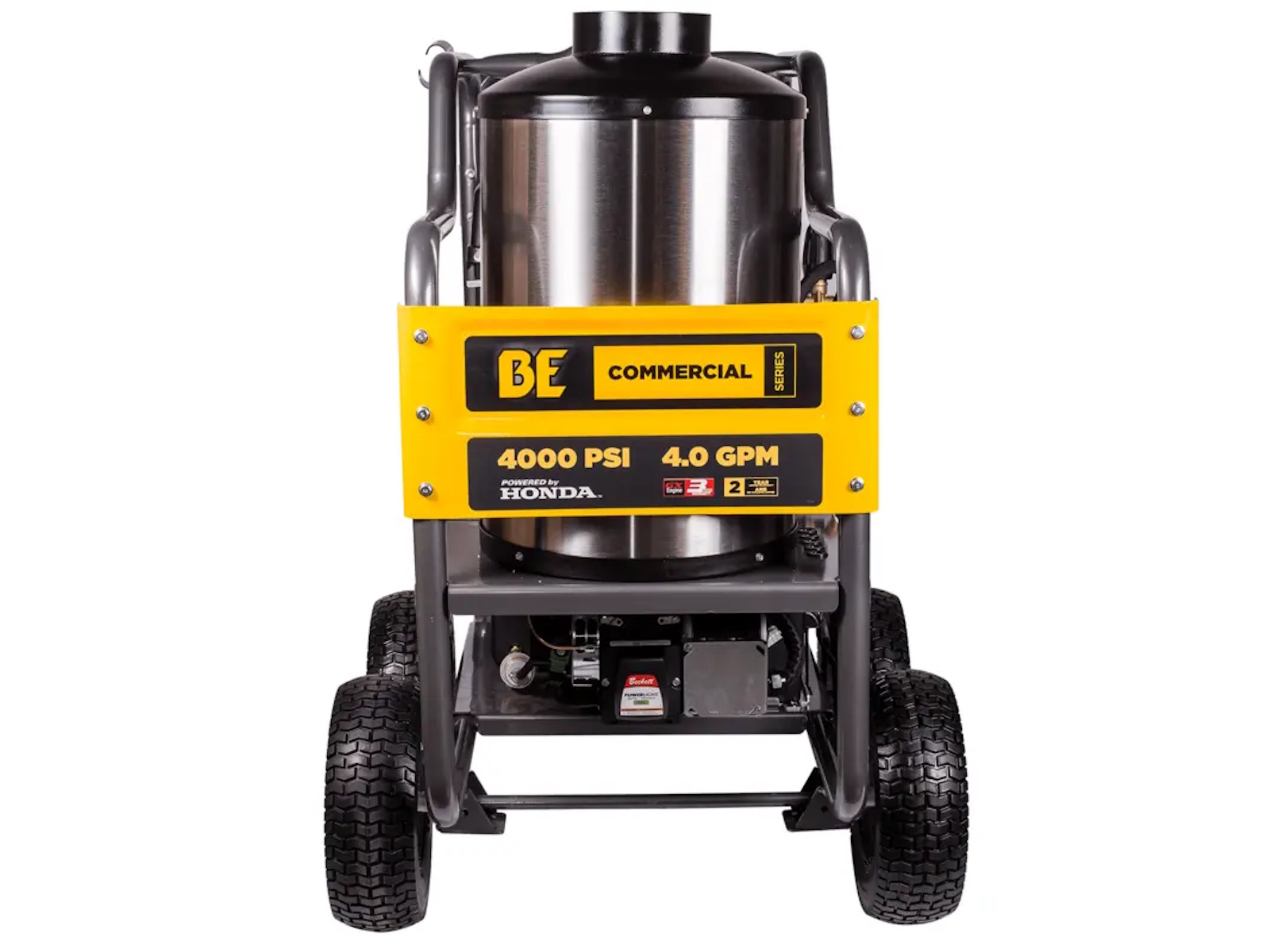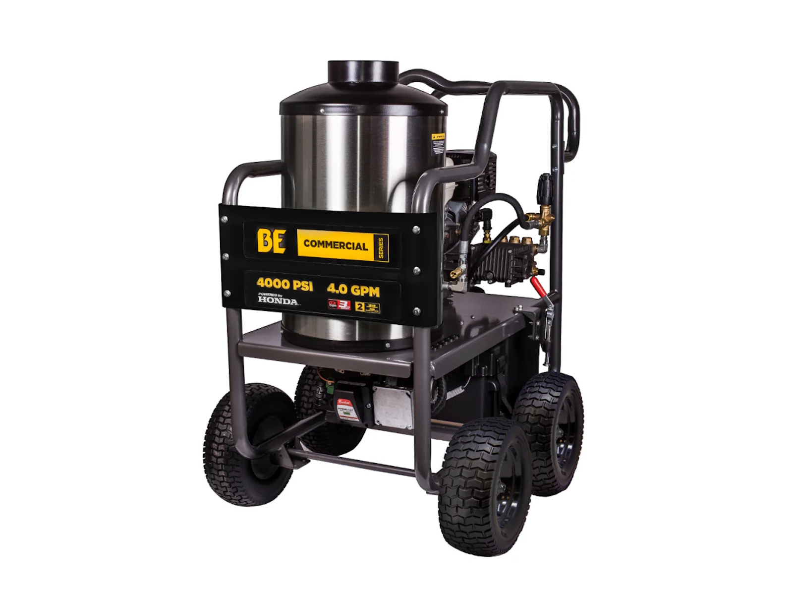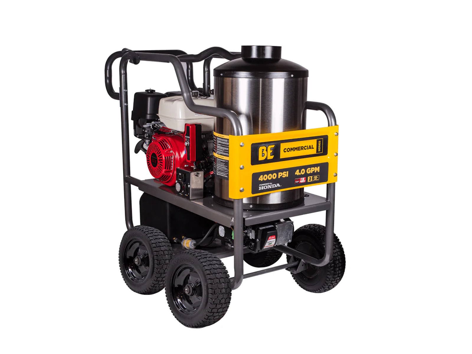 When high-pressure cold water isn’t enough, the BE Power Equipment HW4013HG steps up with high heat and serious cleaning muscle. Engineered for commercial-grade applications, this hot water pressure washer is designed to melt through grease, oil, and heavy grime where traditional pressure washers fall short. Powered by a Honda GX390 electric start engine and paired with a General triplex pump, this unit pushes out 4,000 PSI at 4.0 GPM—making it the ultimate solution for demanding industrial, agricultural, and commercial cleaning tasks.