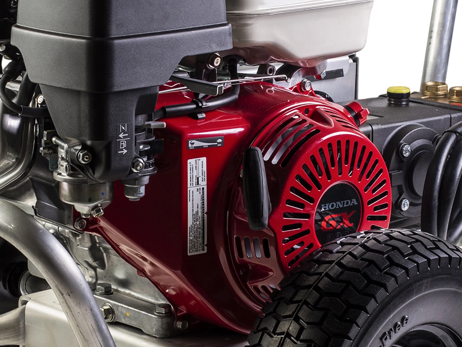 The large capacity fuel tank provides longer runtime, an automatic low oil shutdown shuts the engine off if your oil is low and a thermal relief valve on the pump dumps built-up hot water if you happen to leave your pressure washer running and unattended. Featuring a durable, hand truck frame design and large 12 in. flat-free wheels, this pressure washer is designed for easy transport.