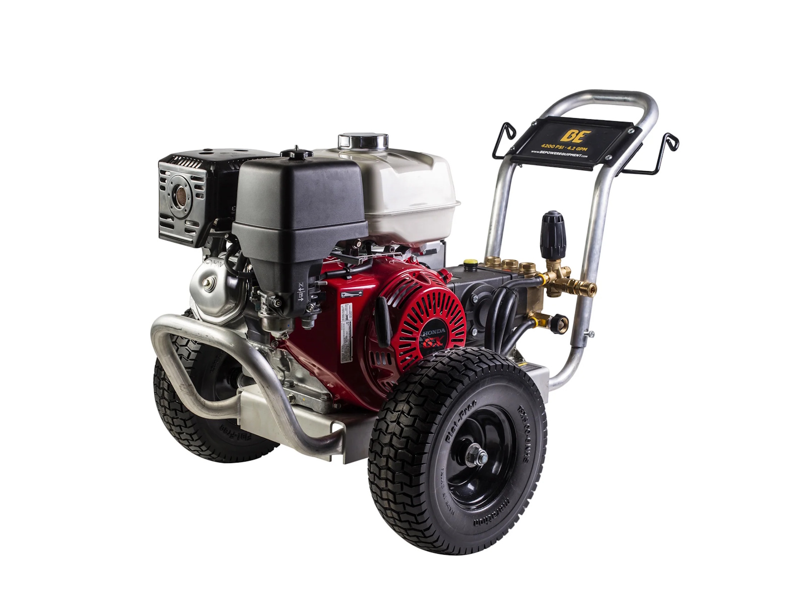 The BE Power Equipment B4213HABGS 4200PSI/4.2GPM Pressure Washer is engineered to handle even your toughest jobs commercial or residential. Built on an aluminum frame to reduce weight and resist corrosion. Powered by a Honda GX390 engine delivering 4200PSI for tackling your toughest jobs.