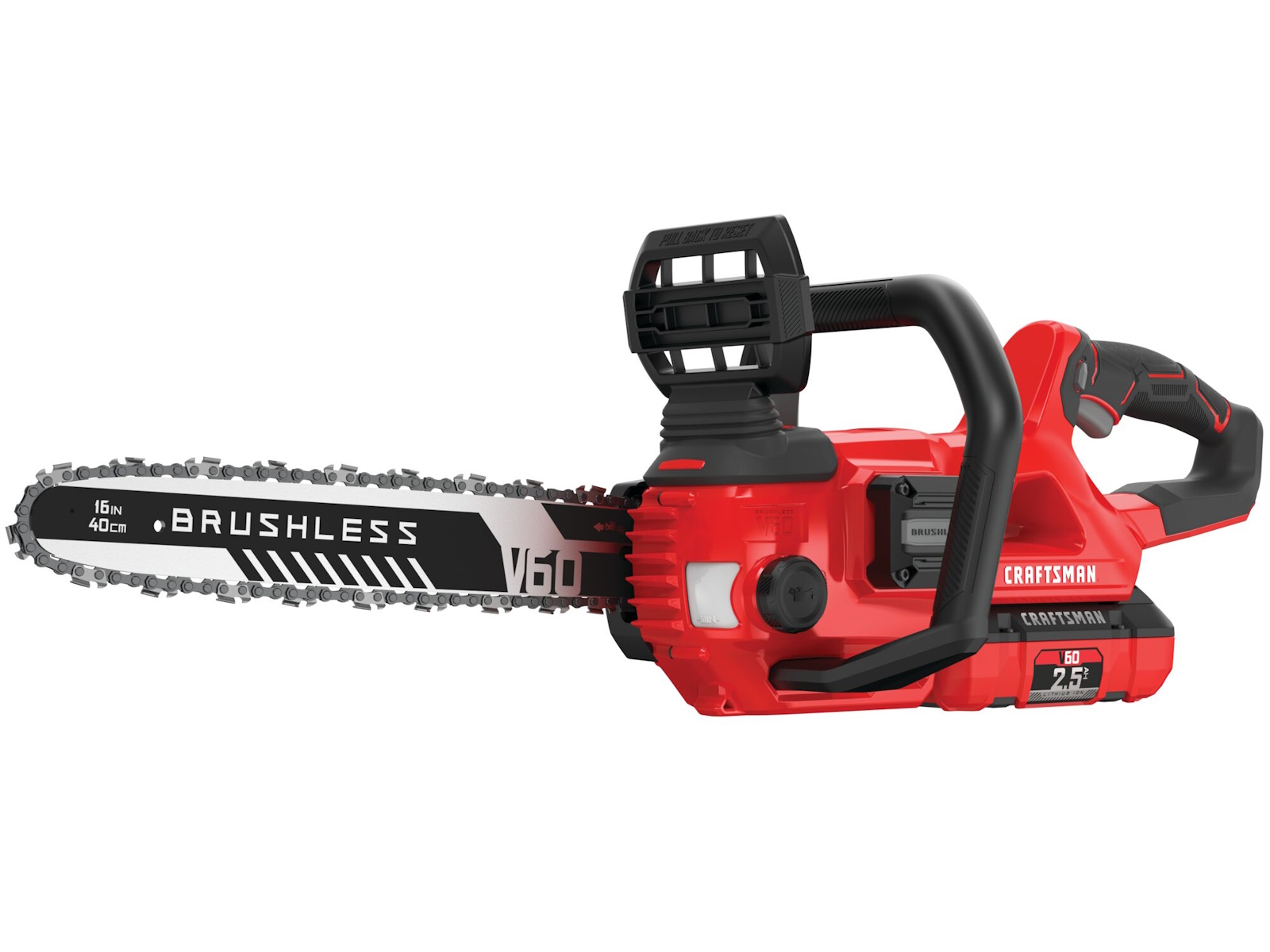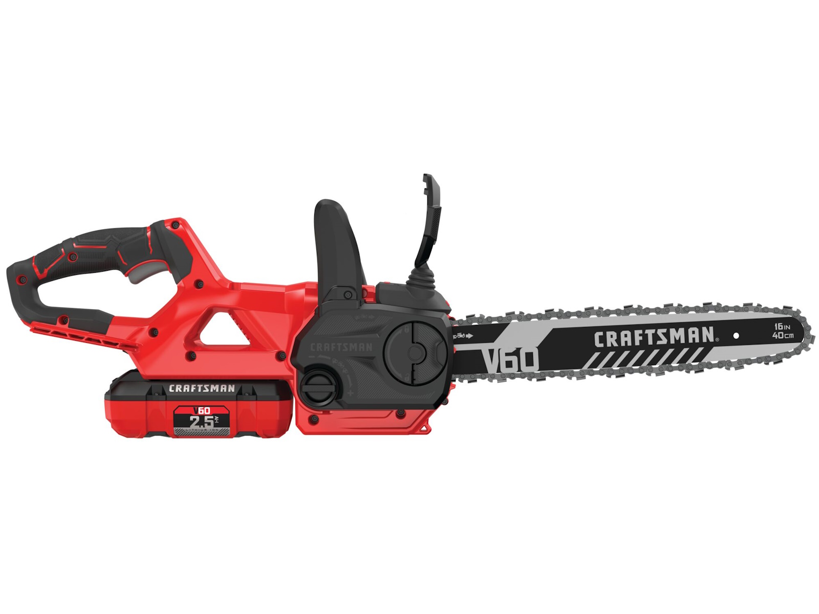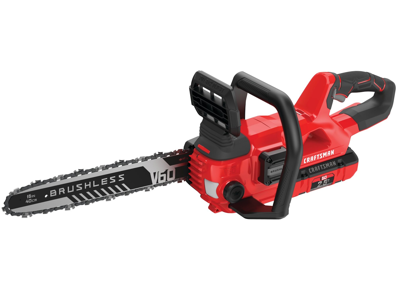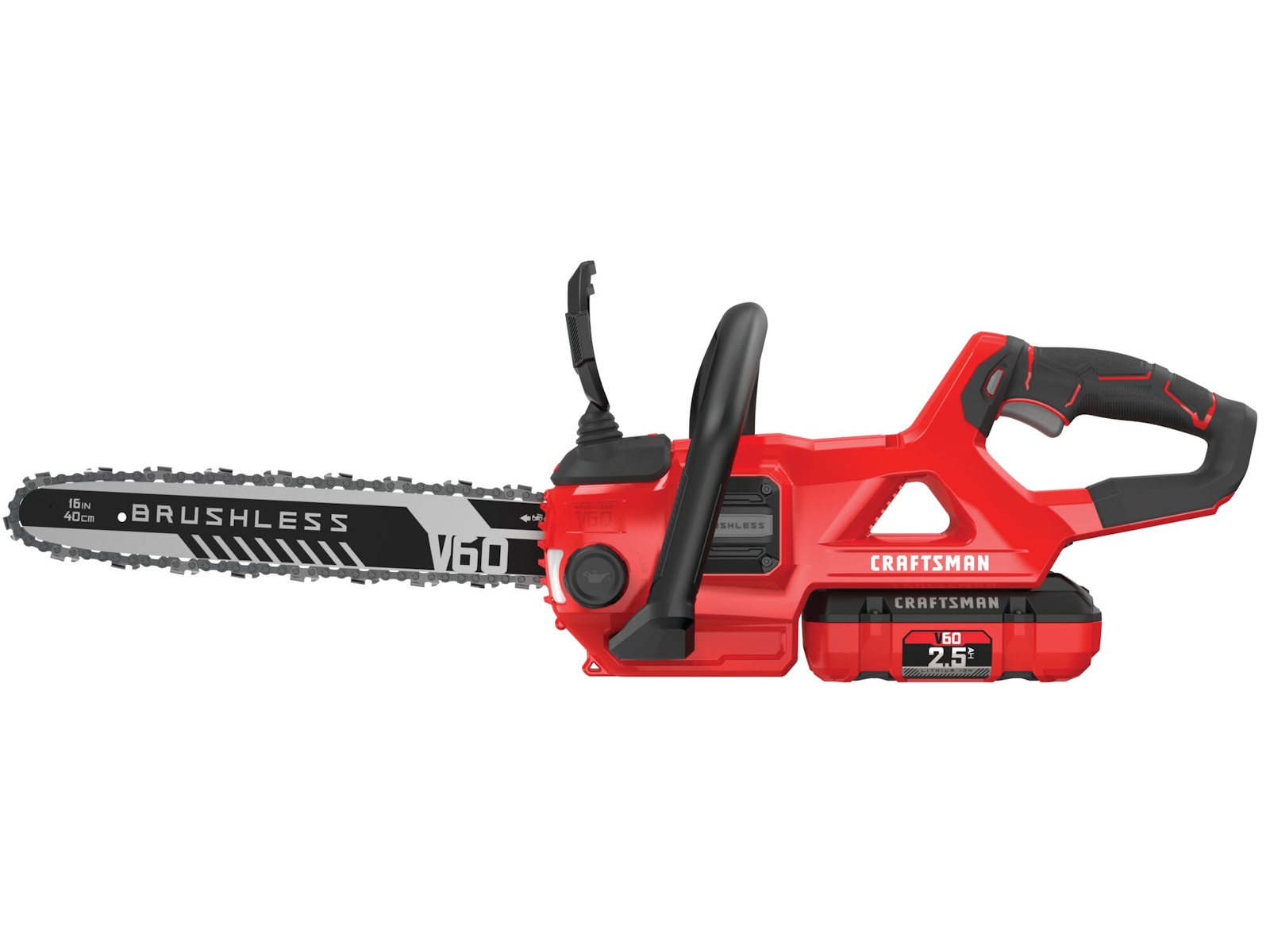 V60 Cordless 16-in. Brushless Chainsaw features a high efficiency brushless motor and is equipped with a 2.5 Ah battery allowing you to power through yardwork. This chainsaw is also auto oiling with tool free tensioning for minimal maintenance. Once the task is complete, conveniently store using the integrated VERSATRACK™ hook with the VERSATRACK™ system (sold separately). The V60 battery platform makes this product compatible across all V60 CRAFTSMAN® tool. You will find a complete line of outdoor tools and equipment essentials for a job that will make you proud.