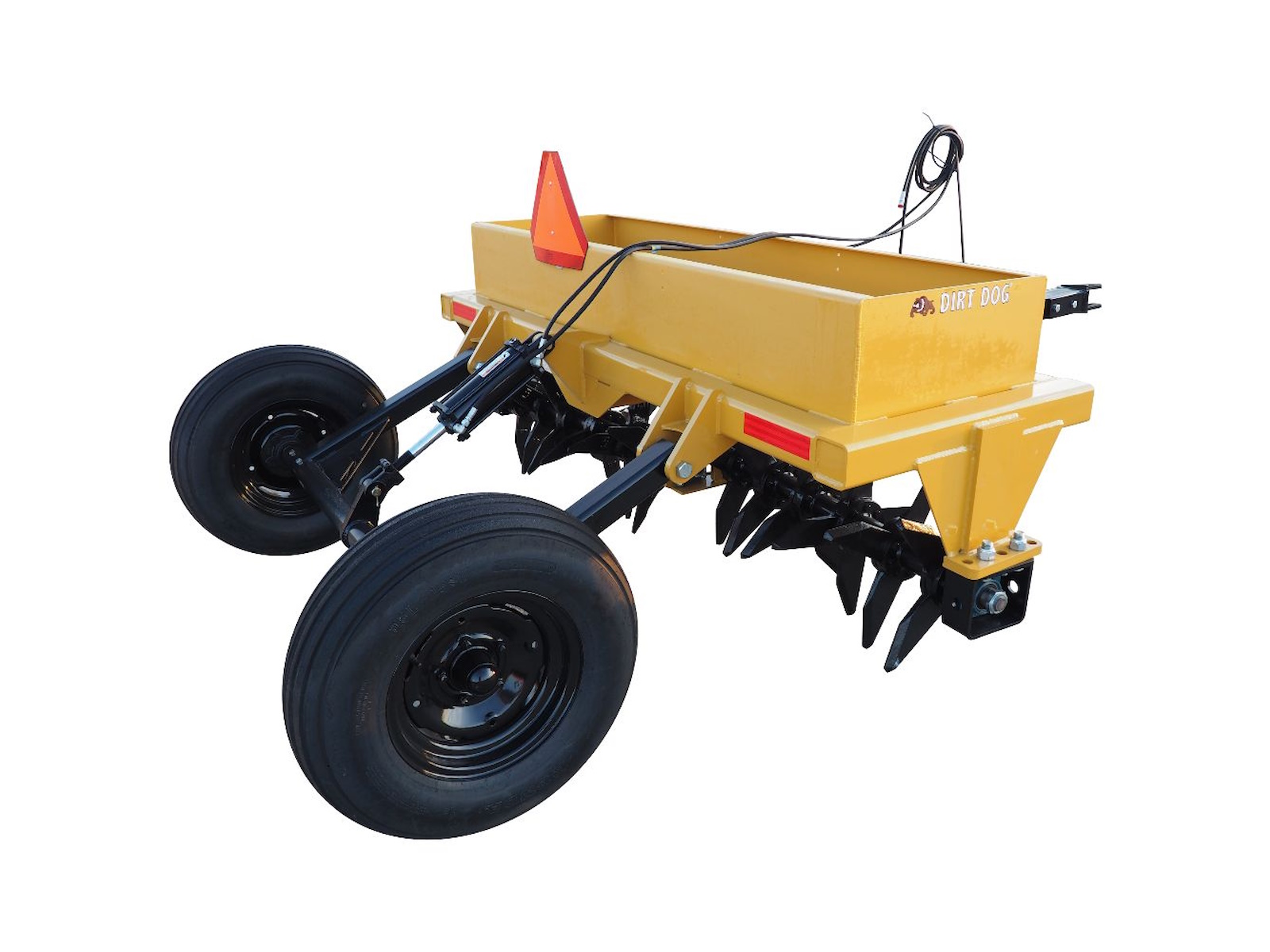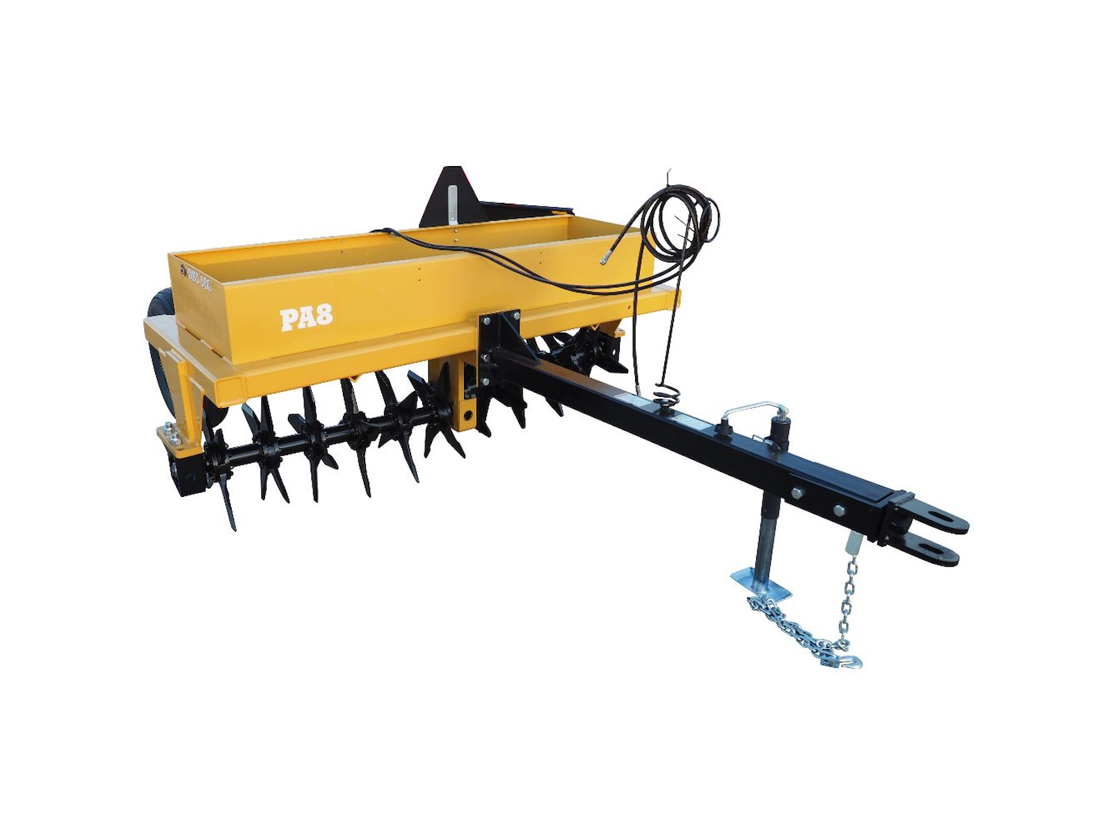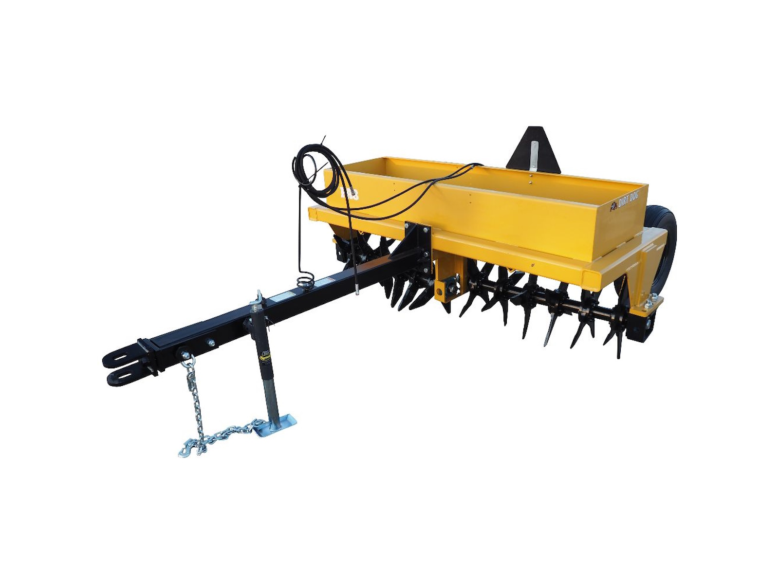 Dirt Dog’s PA Series pull-type Pasture Aerators are ideal in agricultural conservation tillage and pasture renovations. The heavy-duty, knife-like tines on the aerator are designed with a twist in them to break-up compacted soil horizontally and vertically as they slice into the ground in a twisting fashion. This breaking action conditions the soil to soak up run-off water faster, allow fertilizer to penetrate deeper into the ground, and increase oxygen and water supplies to the plant roots. The built-in, metal weight box allows you to add any type of weight to help the aerator tines penetrate into the ground and reach maximum depth.