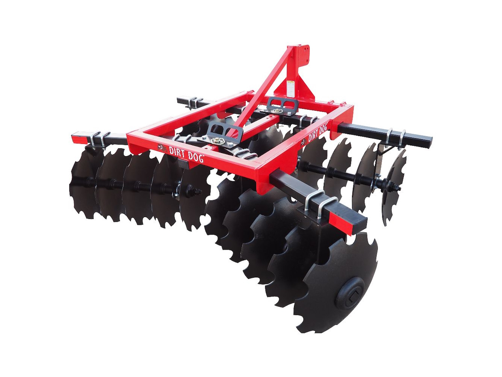 Dirt Dog’s line of lift disc harrows is designed to expand your tractor’s productivity potential! Whether you are a gardener, small farmer, wildlife manager, landscaper, operate a nursery or simply someone looking to break up the ground, the heavy duty frames and the heat-treated notched disc blades of Dirt Dog’s lift disc harrows make them the right choice for the job. The three disc harrow series in the Dirt Dog line are designed to fit tractors from 35 to 95 horsepower, giving you several choices to properly fit your tractor and application. Easy-to-adjust front and rear gangs allow you to change from light tilling to more aggressive cutting action with a simple pull of a pin and repositioning of the gangs. The sky, well actually the dirt, is the limit when using a Dirt Dog lift disc harrow to solve your groundbreaking needs.