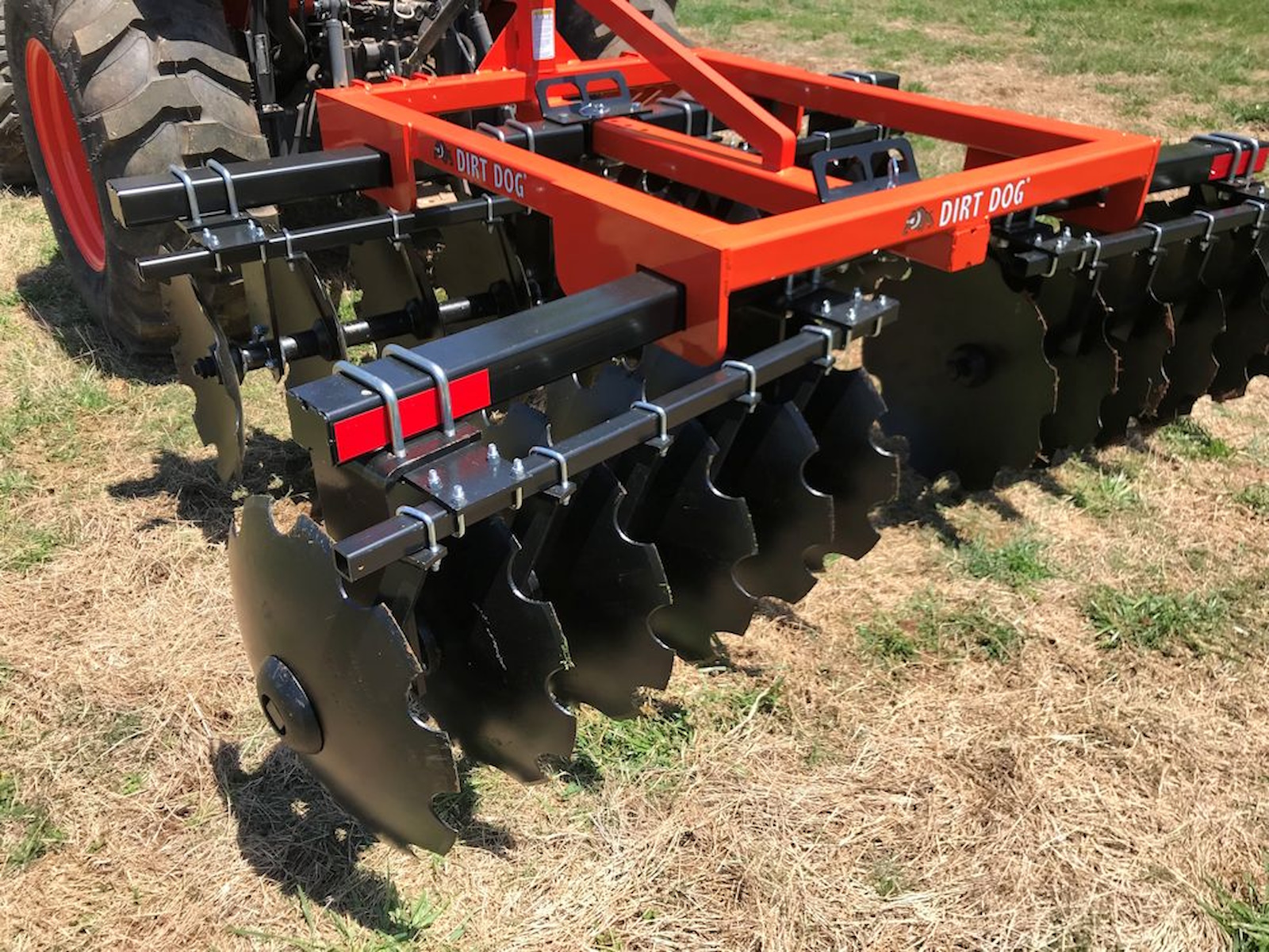 Dirt Dog’s 300 series harrows are the largest three point lift harrows in our line. They are designed to be used with cat I & II three point lift tractors up to 95 horse power. The Quick hitch compatible triple lug hitch and 3” square tube frame make the 300 series an extremely heavy duty disc harrow. The 300 gangs can be configured with 9” or 7 ½” spacing and 20” or 22” disc. Gang angles are adjusted by an index pin and handle assembly that makes adjustments easy. The front gangs angle from 0° to 21° with the rear angling from 7° to 21°. Notched, 3.5mm boron discs are standard on the 300 and sealed, self-aligning bearings keep them turning smooth throughout the life of the harrow. The ½” x 7” reinforced gang hangers that are bolted to the 4” x 3” x ¼” gang tubes provide the unyielding connection needed to transfer your tractors power to the cutting edge of the disc, making this one of the heaviest, capable disc harrows in its class. Dirt Dog’s 300 series is available in widths from 78” to 118” and can be powder coated in red, green, orange, blue and yellow.