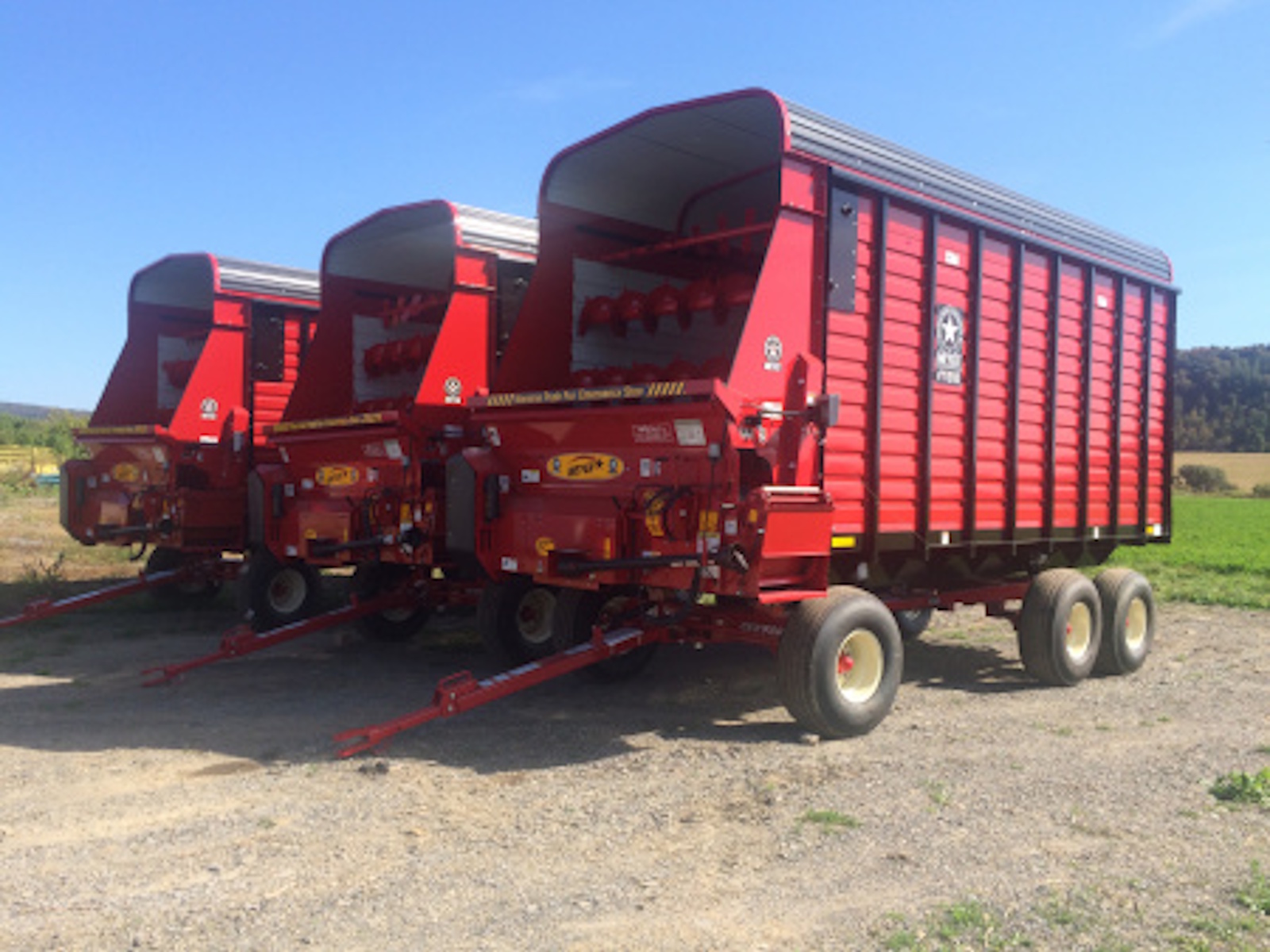 Commercial Grade Geardrive (no worm gears): Std | HD Top Rail Formed (no side supports needed): Std | HD Tubular Floor Supports: 2x2 | All Steel Frame - 24” centers (no wood): Std 24” | Tubular Upright Spacing: 24” | Front Apron Drive Shaft: 2” | Capacity cu. ft. (with roof) (7’3”) high sides: 1067 | Capacity cu. ft. (with roof) (6’3”) std height: 944 | Capacity (struck level) cu. ft. (without roof) (7’3”) high sides: 892 | Capacity (struck level) cu. ft. (without roof) (6’3”) std height: 769 | Stringer Width/Height wagon mount: 42”/10” | Stringer Width/Height truck/XT2200 trailer mount: 33.5”/6” | Overall Height (with roof) - wagon mount version high sides: 126.5” | Overall Height (with roof) - wagon mount version std height: 114.5” | top of door pivot (RT/RTX200 only) std height: 103” | top of door pivot (RT/RTX200 only) high sides: 115”