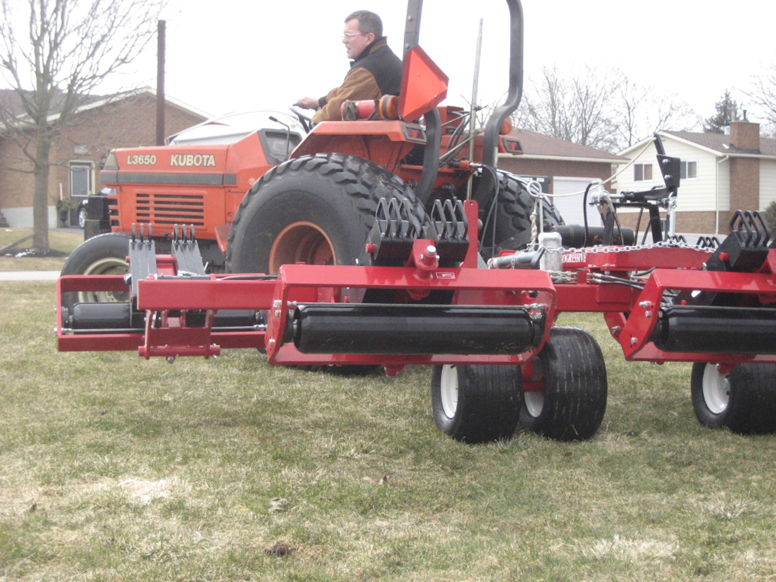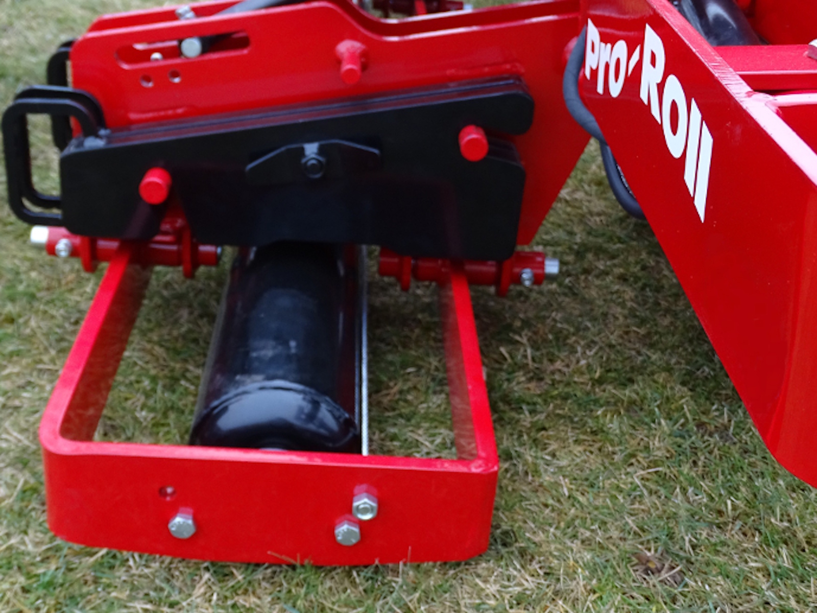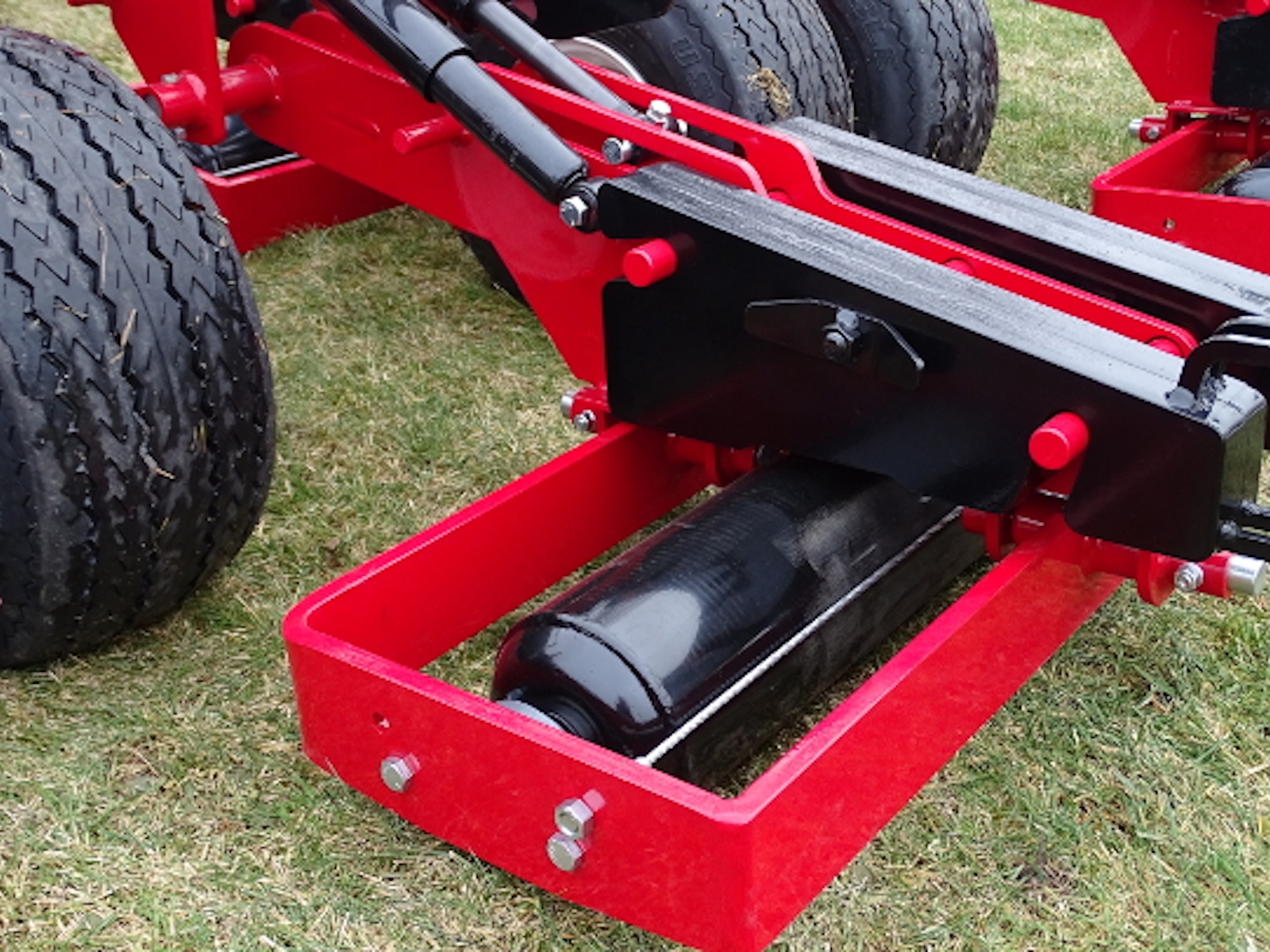 Each of the 26″ long, heavy-walled 6 inch diameter steel rollers are housed in a wrap-around frame for protection. The roller ends are rounded to be easy on the turf. For durability, the pivots are straddle mounted and an over-sized flanged bearing supports the ends of each roller. Replaceable bushings and pins are incorporated at all key pivot points.