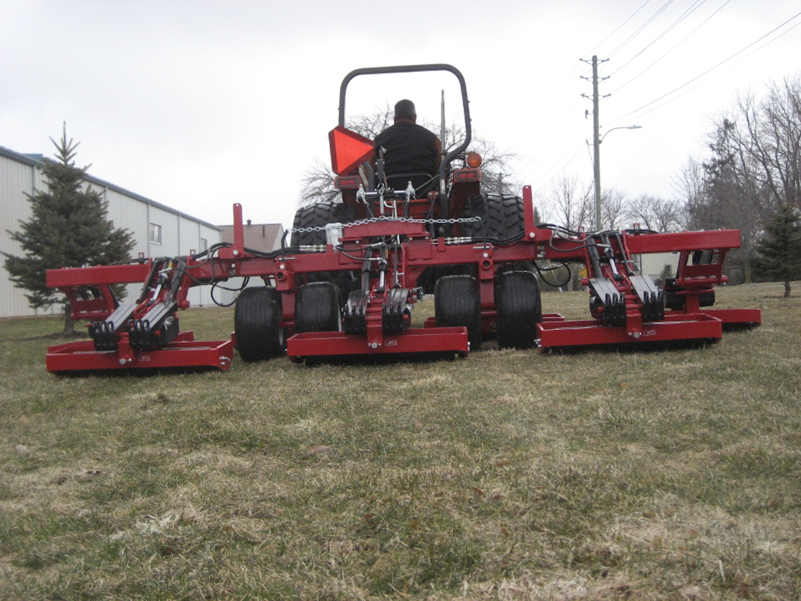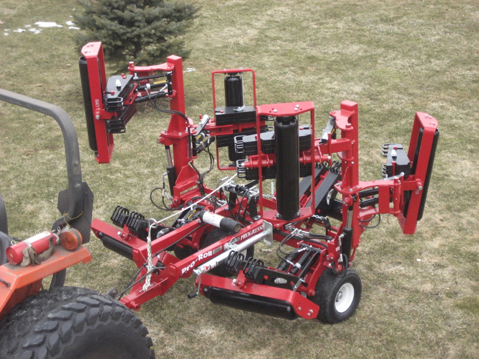 The Pro-Roll folds to a transport width of 7’11”. This allows it to easily pass through a storage shed door or travel along a tree lined cart path. The outer wings are hydraulically raised and lowered and will automatically lock (mechanically) when raised for transport. All wing functions are controlled by the Operator from the tow vehicle’s seat, dismounting from the tractor is not required.